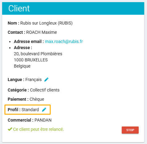 Le profil du client s'affiche au niveau de la fiche client lorsqu'il est renseigné.